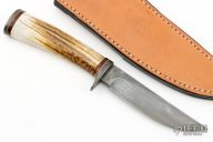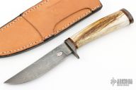 This Hunter by Mike Sanders has an Alabama Damascus blade, .161" blade stock and .959" blade depth, hidden tang construction. The handle has Damascus guard and butt with a stag grip. Comes with a brown leather sheath and a zippered case. Excellent condition.