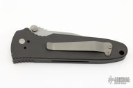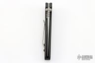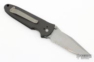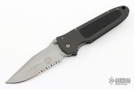 This Janich Tempest by Masters of Defense has a bead blasted partially serrated blade with notched thumbrest and dual thumbstuds. Handle is dark aluminum with non-slip inserts and a stainless steel reversible clip.  Includes original black nylon sheath. Has a few light scuffs, otherwise excellent condition.