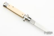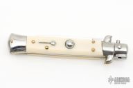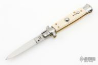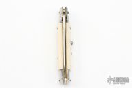 This Swivel Bolster features a spear point blade. The handle is comprised of stainless steel bolsters and pommel with white acrylic scales over brass liners and stainless steel backspacer. Excellent Condition.