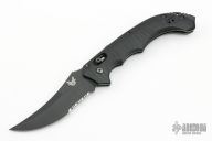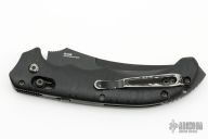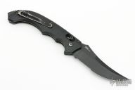 Well-balanced, symmetrical, eye-catching, The Bedlam has a black coated 154CM partially serrated blade that is released with the AXIS locking button.  Safety on top of knife. Sculpted black G10 handle fits comfortably and securely. Reversible tip up black clip. Has scuffs and scratches, has been used and carried. Fair condition.