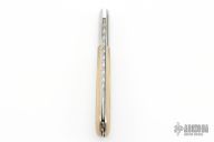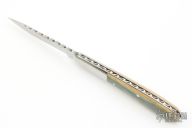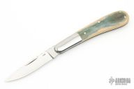 This slipjoint by the Late Joe Kious features a hand rub satin finished blade with nail nick and fileworked spine. The handle has stainless steel dovetailed bolsters, mammoth ivory covers with stainless steel pins, and stainless steel liners and fileworked stainless steel backspacer. Has half-stop, flush in all positions. Has a few light scratches, otherwise excellent condition. Comes with a Velcro pouch.