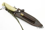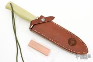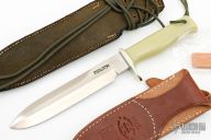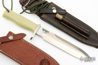 This knife is from a special run by Capt. Chris Stanaback. Features a satin finished double edged blade with notched thumbrest, .206" blade stock. 1.319" blade depth, stainless steel blade, full tang construction. The handle has a nickle silver guard, jade G-3 insulator handle from NASA, lanyard hole. This knife was designed to meet the demand for an almost indestructible all-purpose knife, though it is especially suited for combat and survival purposes. Comes with a brown leather sheath with NASA Meatball Logo, also comes with an additional Model C style brown leather sheath by Savage Made Sheaths. Excellent condition. 1 of 25 made. Very exclusive.