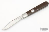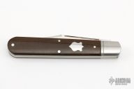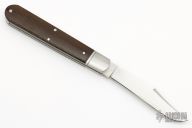This slipjoint by Matsumoto Kurosawa features a hand rub satin finished blade with nail nick. The handle has threaded stainless steel bolsters, micarta covers with steel escutcheon.  Stainless steel spring. Has half-stop, flush in all positions.  Excellent Condition.