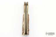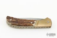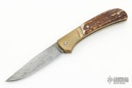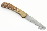 This slipjoint by Richard Wright features a Damascus blade. The handle has fluted brass bolsters with integral liners, stag covers, fileworked stainless steel spring. Has half-stop. Has some patina and a nick in the blade edge, otherwise good condition. Comes with a zippered case.