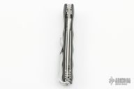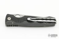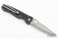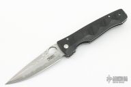 This linerlock folder by Mcusta features a Damascus drop point blade marked "MCUSTA, SEKI JAPAN". The handle has micarta scales with stainless steel liners and a tip down pocket clip. Comes with original box. Excellent condition.