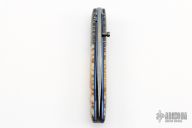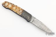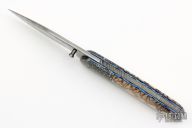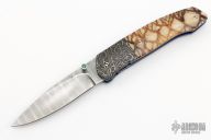 This knife by Stephen Olszewski features a Damascus blade with a single thumbstud blue stone inlay. The handle has mosaic Damascus bolsters, coral scales, anodized titanium liners with fileworked spines, carved and fileworked Damascus backspacer. Has nice detent and blade seating, and lockup. Has a couple of light scratches otherwise the knife is in Excellent condition.