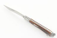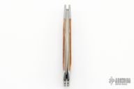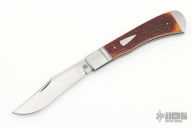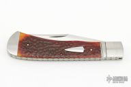 This Trapper slipjoint by Trae Gaenzel features a hand rub satin finished blade with nail nick. The handle has fluted and threaded stainless steel bolsters, jigged bone covers with stainless steel escutcheon, stainless steel liners with fileworked spines, stainless steel spring. Has half-stop, flush in all positions. Comes with a zippered case. Excellent condition.