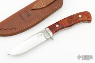 This Hunter from Larry Page features a mirror polished drop point blade, .179" blade stock and .966" blade depth, full tapered tang construction. The handle is comprised of a polished nickel silver guard with stabilized maple burl scales over red liners. Marked #4320 on the underside of the tang and on the back of the sheath. Excellent condition. Includes leather sheath with belt loop.