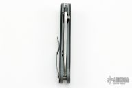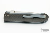 This linerlock folder by Kirby Lambert features a hand rub satin finished spear point blade with a thumbstud and a notched thumbrest. The handle has carbon fiber scales, bead blasted and anodized titanium liners, titanium barrel spacers, and a tip up anodized titanium clip. Excellent condition. Nice detent, lockup and blade seating.