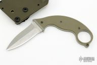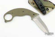 This Punch Badger by Tracker Dan features a stonewashed dagger blade with false top edge, .119" blade stock and 1.215" blade depth, full tang construction with green G-10 scales. Has an ambidextrous kydex sheath with belt clip. Excellent condition.