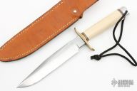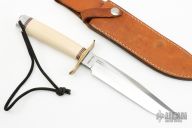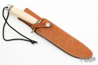 This Model 1-7 by Blackjack Knives features a satin finished blade with a false top edge, .210" thick and 1.184" deep, hidden tang construction. The handle has a brass guard, ivorite grip with red/white/black spacers, aluminum butt, lanyard hole. Comes with brown leather sheath. Excellent Condition.