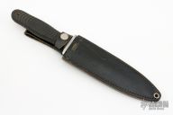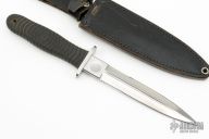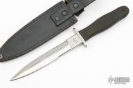 This dagger features a Spear Point blade with fullers, partial serrations and a hidden tang construction.  .247" Blade Stock.  1.012" Blade Depth.  The handle has a steel guard with a rubber grip.  Includes a black leather sheath.  Scuffs and scratches are visible otherwise the knife is in okay condition.