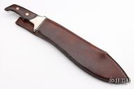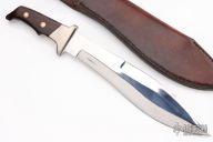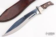 This knife by David Grant features a mirror polished blade with sharpened top edge, .257" blade stock and 2.656" blade depth, full tang construction. The handle has stainless steel bolsters and cocobolo scales. Comes with a brown leather sheath. Has a couple light scratches, otherwise excellent condition. #263 on ricasso