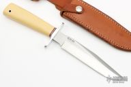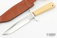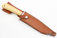 This Model 1-7 by Blackjack Knives features a satin finished blade with false top edge, .216" thick and 1.207" deep, hidden tang construction. The handle has an aluminum guard, black micarta grip with red/white/black/leather spacers. Comes with brown leather sheath. Excellent Condition.