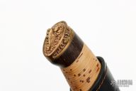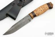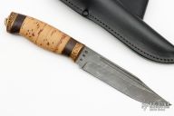 This Voykar HT by Olamic Cutlery has a H.C.V.D. Damascus blade stamped #034, has fullers and a clip point, .173" blade stock and 1.272" blade depth, hidden tang construction. The handle has a cast bronze guard and butt with lanyard hole, stacked birchbark grip with wenge wood spacers. Includes a black leather sheath with belt loop and zippered case.  Excellent condition.