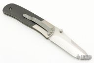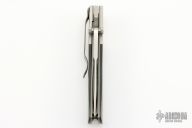This 458 Magnum linerlock folder Greg Lightfoot features a satin finished blade with dual thumbstuds and notched thumbrest. The handle has titanium bolsters, carbon fiber scales, bead blast titanium liners and a tip down bead blasted titanium clip. Nice detent, blade seating and lockup. Includes a kydex sheath.  Heavily scratched otherwise the knife would make a great user.