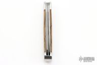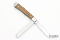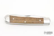 This slipjoint by Maker Moore features mirror finished blades with nail nicks. The handle has stainless steel bolsters, wood covers with nickel silver pins, stainless steel liners and springs. Has a few light scratches, otherwise excellent condition.