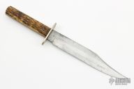 This antique bowie by Joseph Allen & Sons of Sheffield England features a clip point blade with false top edge, .145" blade stock and 1.094" blade depth, full tang construction. The handle has nickel silver guard, jigged bone scales. Has scratches and patina, otherwise good condition for a 100 year old knife.