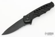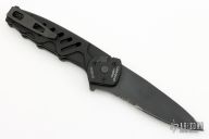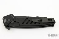 This knife features a black spear point blade with partial serrations.  The handle features a black aluminum with a matching tip up pocket clip.  Includes the original box and papers.  Glass breaker in the butt.  There are a couple of light snail trails on the frame otherwise the knife is in excellent condition.