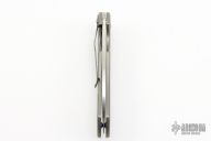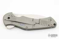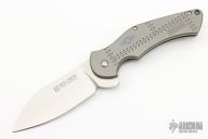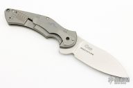This Pro Series Junkyard framelock flipper by Tim Galyean features a stonewashed drop point blade with flipper. The handle has a milled and bead blasted titanium frame with matching titanium clip, tip down carry, and anodized titanium barrel spacers. Nice lockup, detent, and blade seating. Includes a padded zippered case.  Excellent condition. PROTOTYPE