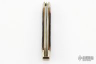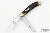 This Bayou Trapper by Northfield Knives features polished blades with nail nicks. The handle has nickel silver pinched and fluted bolsters, Chestnut Peach Seed Jigged Bone covers with a nickel silver beaver escutcheon, brass liners/pins. Has half stops. Comes with original tube. New condition.