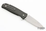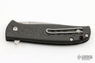 This Skaha By North Arm Knives features a drop point blade with milled bevels, a notched thumbrest and flipper.  The handle has carbon fiber scales with an inlaid stainless steel liner and tip up clip. Rides on bearings, nice detent, lockup and blade seating. Excellent condition.