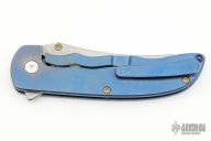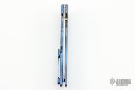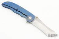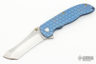 This Norseman (#2226) by John Grimsmo features a tumbled blade with dual anodized titanium thumbstuds, notched thumb ramp and flipper. Anodize and stonewashed titanium frame with a reverse honeycomb pattern front scale and anodized titanium screws. Very smooth action that requires no wrist movement. Nice detent, lockup and blade seating. Rides on ceramic bearings. Comes with original hard case and COA dated April 24, 2019. Knife is in excellent condition and shows no signs of use or carry.