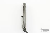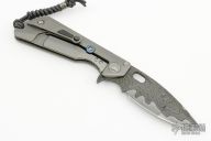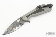 This MSG-3.5 by Mick Strider and Tony Marfione features a compound ground Armor Core San Mai Damascus blade with notched thumbrest and flipper. The handle has a milled and bead blast finished integral titanium frame with carbon fiber inlay, a tip up clip with ceramic ball and carbon fiber inlay, anodized titanium lockbar stabilizer, lanyard hole at the butt. Nice detent, lockup and blade seating. Comes with original box, zippered case and COA. Dated 11/2016. S/N 016. Has a couple light scuffs, otherwise excellent condition.