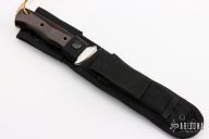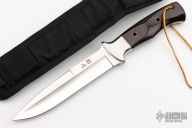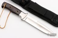This SERE fixed blade from Al Mar Knives features a double-edged blade with .199" blade stock and 1.357" blade depth, full tang construction. The handle has stainless steel bolsters, black/red paper micarta, brass tubes and lanyard hole. Comes with a black nylon sheath. Excellent condition.