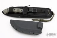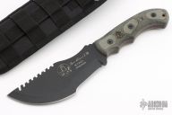 This Tom Brown Tracker by Tops features a black coated blade with sawteeth on the spine, .240" blade stock and 2.427" blade depth, full tang construction. The handle has black/green linen micarta scales with red liners. Comes with a kydes sheath and a nylon sheath. Excellent condition.