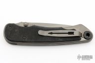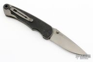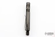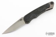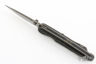 This Akribis linerlock folder by Spartan Blades features a black PVD finished drop point S35VN blade with dual thumb studs and a notched thumb rest. The handle has carbon fiber scales, sand PVD titanium liners, black G-10 backspacer and tip up sand pvd titanium clip. Has nice detent, lockup, and blade seating. Has some scratches and scuffs, otherwise good user condition.