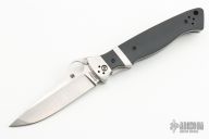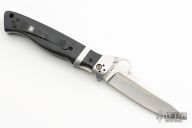 This Vallotton Sub-Hilt Auto by Spyderco was converted by Butch Vallotton, it features a satin finished S30V blade with a thumb-hole, dual thumb-studs, and notched thumb-rest. The handle has stainless steel bolsters, black G-10 scales, stainless steel liners, black G-10 backspacer, and 4-way reversible black stainless steel clip. Nice detent, lockup and blade seating. Excellent condition.  #276