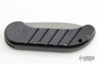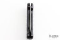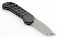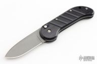 This knife is a baby "Black Knife" automatic by Rob Dalton. Powerful side-opening coil-spring action. Bead blast blade. The handle has a black aluminum frame with lanyard hole at the butt. Nice function. Has some scuffs, otherwise good condition with the typical minor play at lockup.
