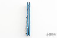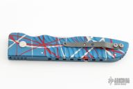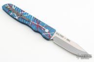 This Minuteman Side Opening Auto by Rob Dalton has a satin finished flats, with bead blasted grinds, clip point blade. "First To Fight" on A-side, "Dalton - USA" on B-side. Handle is blue/red/white anodized aluminum with milled contours, and 13 divots around the pivot for each of the original 13 colonies, tip up bead blasted titanium clip. Typical Dalton coil-spring response when you push the bead blasted stainless steel auto button. Excellent condition.