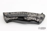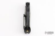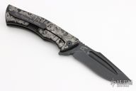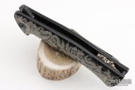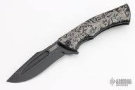 This is an impressive collaborative knife design from Zieba Knives and Jason Knight. Its rounded titanium frame lock handle is contoured for comfortable use, and has a custom finish. The knife sports a unique harpoon style recurve blade with stylized grooves and a flipper tab. The knife comes complete with a machined titanium pocket clip for secure tip-up carry. Features: M390 blade steel offers superb edge retention and wear resistance. Titanium handle construction provides a durable, lightweight frame. Steel lock bar insert for secure over-travel protection. Silver skull backspacer. Ceramic ball-bearing pivot makes blade deployment a snap. Comes with original box. Excellent condition.
