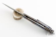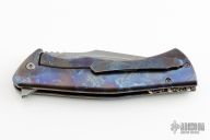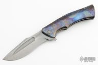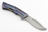 This S5 "Southern Star" is an impressive collaborative knife design from Zieba Knives and Jason Knight. Its rounded titanium frame lock handle is contoured for comfortable use, and has a "Smoke Blue" anodized finish. The knife sports a unique harpoon style recurve blade with stylized grooves and a flipper tab. The knife comes complete with a machined titanium pocket clip for secure tip-up carry. Features: M390 blade steel offers superb edge retention and wear resistance. Titanium handle construction provides a durable, lightweight frame. Silver skull backsapcer. Steel lock bar insert for secure over-travel protection. Ceramic ball-bearing pivot makes blade deployment a snap. Comes with original box and COA dated 11-09-20. also comes with an anodized titanium backspacer. Excellent condition.