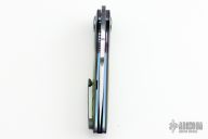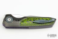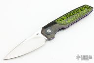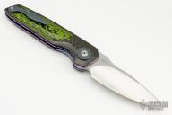 This Silver Slimline by JD Van Deventer features a drop point hand rub satin finished blade with swedge and notched front flipper. The handle has carbon fiber scales with green carbon fiber inlays, anodized titanium collars, anodized titanium liners, tip up titanium clip, carbon fiber backspacer. Rides on IKBS. Excellent condition. Comes with a zippered case.