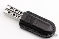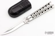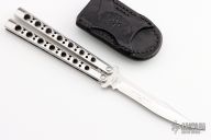 This Model 43 by Benchmade features a tumble finished blade. The handles are satin finished titanium with spring latch. Comes with original box, papers, and a leather sheath. Excellent condition.