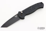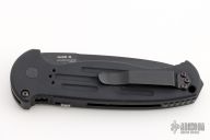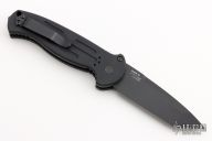 This 9052BK AFO II auto has a black tanto blade. Black anodized aluminum handle. Integrated safety system. Black stainless steel clip - up or down reversible, and lanyard hole. Comes with nylon sheath. Excellent condition.