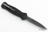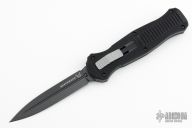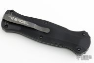 "Introducing an OTF like none-other.. The new Infidel® is rapidly making believers out of many a skeptic. Built for strength and reliability the patent pending double-action mechanics get it done over the long haul. Grab on and you will find the handle grip rock-solid with its patented machined in Presidio® style bi-directional tread pattern, and overall generous sizing for gloved hands. Intuitively pressure the release-slide forward and its spear-point edged steel fires and locks up with a unique three-point retention system with amazingly negligible blade play. Reverse the process and the blade retracts in a rapid blur of motion. The Benchmade Infidel is a special operator’s fantasy come true."  Includes original sheath, box and papers. Excellent condition.