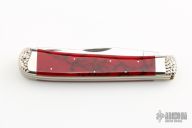 This Custom 2-Blade Trapper by Case has been modified by Brian Yellowhorse. It features two mirror polished blades both with nail nicks. The handle has carved nickel silver bolsters, red jasper covers, brass liners and stainless steel springs. Comes with original box and papers. Excellent condition. #37/250