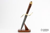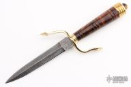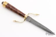 This Dagger by DV Customs features a double-edged 512 layer Damascus blade with hidden tang construction, .165" Blade Stock, .861" Blade Depth.  The handle has a brass guard and butt with a black walnut grip, tiger eye stone in the butt.  Includes a Bolivian wood stand.  S/N 198.  New from maker. Comes with COA.