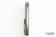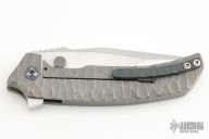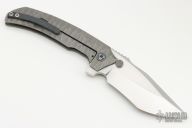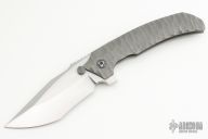This Satori Integral by Peter Rassenti features a hand rub satin finished blade with notched thumbrest, dual textured thumbstuds and flipper. The handle is comprised of a textured integral titanium frame with zirconium pivot collars and a lanyard hole in pommel. The textured zirconium pocket clip is positioned for right hand, tip up carry. Includes a zippered case. Has a couple light scuffs/scratches, otherwise excellent condition.