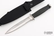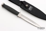 The Desert Dagger from SOG Knives features a Spear Point blade with fullers and contrasting serrations near the guard, .153" blade stock and 1.023" blade depth, hidden tang construction. The Kraton handle provides great grip and feel in the hand, stainless steel guard and pommel. Comes with original black nylon sheath. Excellent condition.