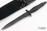 The Mark II by Gerber is one of the best selling knives of all time. First introduced in 1966, this tactical knife is serialized for collectors. Black finished partially serrated double edged blade, .260" blade stock and .944" blade depth, hidden tang construction. Black aluminum handle. Black nylon sheath. S/N K0666S. Has scuffs and scratches, has been resharpened and the serrations on one side are gone, fair condition.
