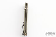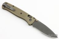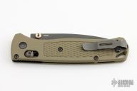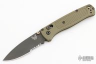 The Benchmade Custom Bugout features a drop point partially serrated blade with a black finish. It's a manual opener with ambidextrous thumb studs. This AXIS lock has green handles with black hardware, a black mini deep-carry pocket clip, and a lanyard hole. Has a couple scuffs, otherwise excellent condition.