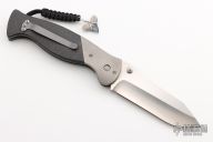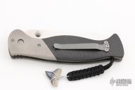 This H-XT Catch Dog by Greg Lightfoot features a satin finished blade with dual thumbstuds. The handle has bead blasted titanium bolsters, carbon fiber scales, bead blasted titanium liners and a tip up bead blasted stainless steel clip. Comes with nylon Velcro belt sheath. Nice detent, lockup and blade seating. Excellent condition.