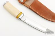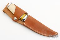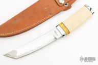 This fixed blade from Keith Coleman features a two-tone tanto style blade with simulated hamon, .249" blade stock and 1.175" blade depth, hidden tang construction. The handle is comprised of a stainless steel guard and fileworked butt, amber and walrus ivory grip. Comes with a brown leather sheath, it is not original, but fits nicely. Has a couple light scratches, otherwise excellent condition.