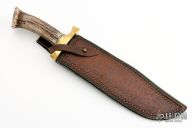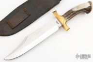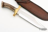 This Bowie by Devon Butch Beaver features mirror polished blade with false top edge and hand rub satin finished flats, .267" blade stock and 1.963" blade depth, hidden tang construction. The handle has brass guard, crown stag grip with black/brass spacers. Comes with a hand tooled brown leather sheath and a zippered case. Has a couple very light scratches, otherwise excellent condition.