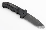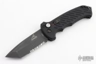 This 06 Side Opening Auto has a matte black finished S30V tanto partially serrated blade. Handle is black aluminum over black stainless steel liners, exposed stainless steel tang butt/ glass breaker/ backspacer with lanyard hole, black stainless steel tip up (RH/LH reversible) clip, and safety button. Has some scratches and scuffs, otherwise good condition.
